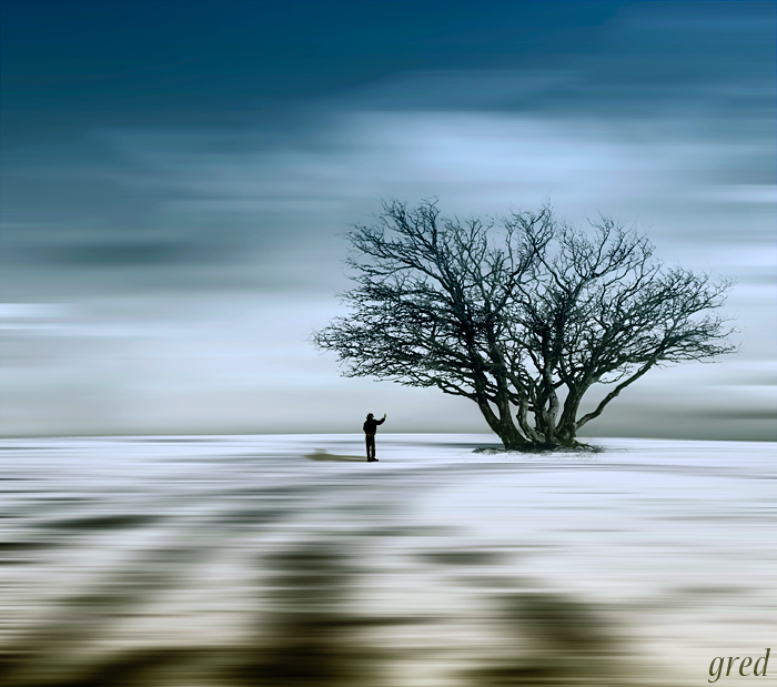 l'effetto dato alla terra e al cielo rende l'idea di un dinamismo diffuso dappertutto tranne nella zona albero/uomo...per cui il titolo è ad hoc.