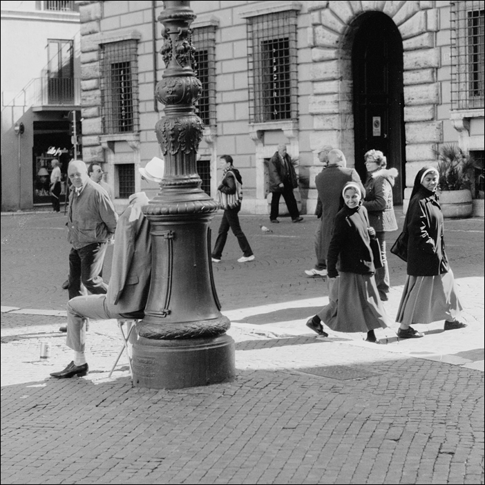 L'esigente formato quadrato risulta ben composto: lievemente in abbondanza il primo piano rapresentato dalla pavimentazione ed una leggera pendenza verso sinistra del fotogramma. Il momento particolare è stato colto benissimo: la performance dell'artista da strada funge da centro di attrazione per lo sguardo divertito delle due suore e per la curiosità dissimulata dell'uomo sulla sinistra. Solo qualche piccola sovrapposizione delle figure di questo genuino racconto candid. La seconda istantanea decisamente meno coinvolgente.