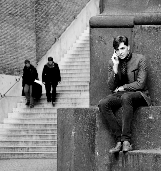 Certo, sono due visioni diverse, una (con diaframma chiuso e tutto a fuoco senza persone a sx) per sfruttare la geometricità che pietre, scale e corrimano formano, l'altra (diaframma aperto e sfondo sfocato al max) per enfatizzare la figura del "telefonista".