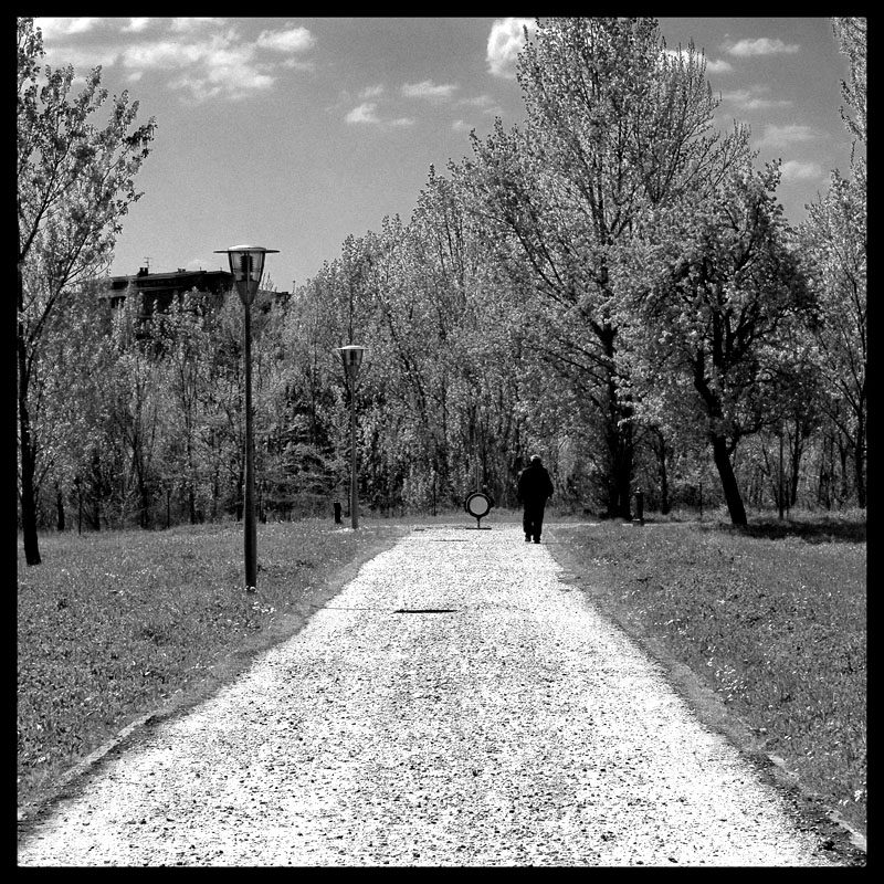 secondo me sarebbe stato meglio collocare l'uomo nel primissimo piano: così facendo la foto avrebbe guadagnato in profondità e l'uomo non si sarebbe sovrapposto troppo con gli alberi; il richiamo con il divieto di transito sarebbe comunque stato evidente.