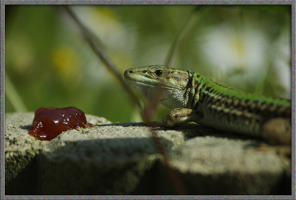 le lucertole sono ghiotte di frutta e marmellata (come quella in foto...); purtroppo per prenderla da vicina, ed all'improvviso, non è sempre possibile evitare rametti e fili d'erba che si interpongono tra la macchina ed il soggetto