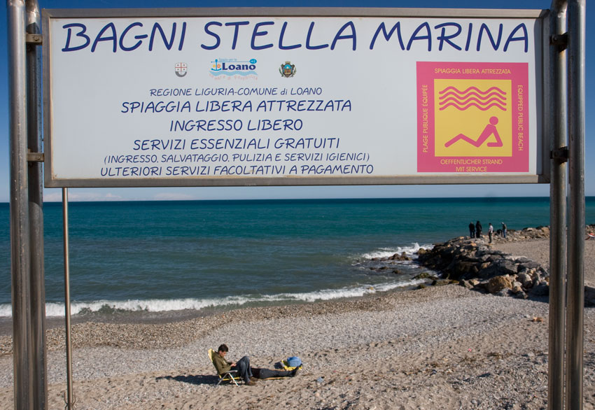 Una foto che coglie una situazione di mare ancora "fuori stagione". Buona la costruzione del fotogramma con il cartello che fa da quinta per le figure ambientate. Ciao Tiziano