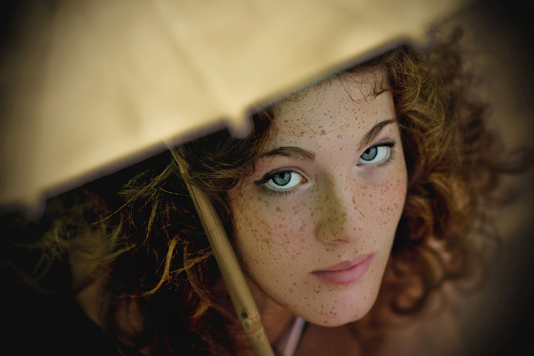 Nulla d'altra parte può togliere cominicativa a questo sguardo luminoso sotto il riparo del parapioggia, con il simpatico concorso di un mare di lentiggini, quasi lienamenti irlandesi, per questa ragazza che ci fissa languidamente dal basso in su.