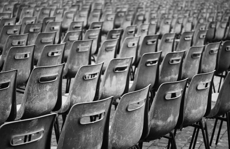 il grigiore porta malinconia allo scatto ma rende l'idea di queste sedie vissute ed immobili come soldatini