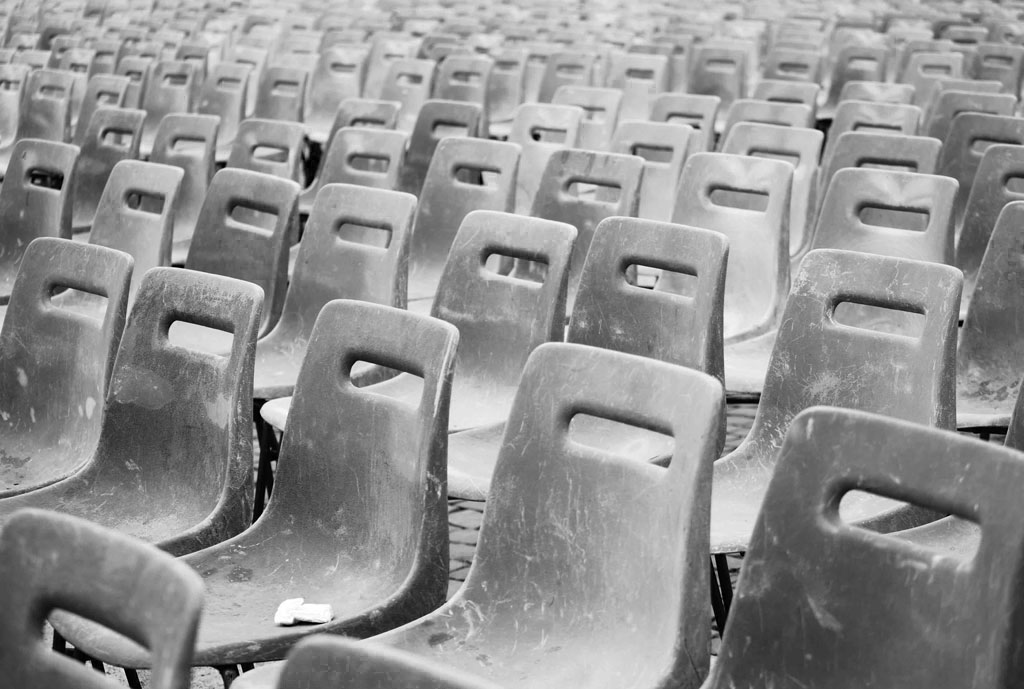 L' "Occupato" sfugge ... per la posizione e per l' effetto generale dovuto al punto di ripresa basso. Alzandolo (ponendosi in piedi su una delle sedie) il risultato migliora assai, non solo rispetto al tuo obiettivo, ma anche dal punto di vista grafico. Ho anche la sensazione che l' oggetto sulla sedia non sia il punto di messa a fuoco (ma potrebbe dipendere anche dalla compressione); un fatto contraddittorio se esso dev' essere il centro dell' attenzione, l' elemento che regge il significato della foto.