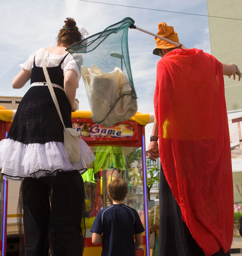 Fondamentale la scritta "game" che introduce in maniera originale questo gioco street di prospettive e di proporzioni. Ecco che i due personaggi, giganti, ai lati del frame, oltre che funzionare da quinte sceniche per introdurre il giovane e piccolo protagonista, partecipano essi stessi al foto-game per via dei loro attributi: primo fra tutti quel retino da pesca pieno di stracci. Quelche disturbo di fondo rappresentato da visi estranei e porzioni di donne a passeggio.