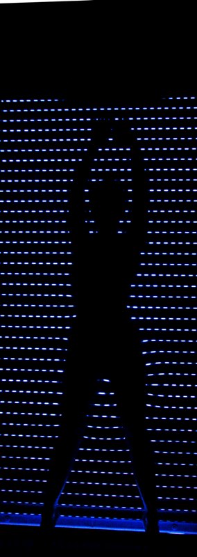 Peccato che la luce bluastra in basso non avvolga l'intera silhouette donandole maggior leggibilità. Avrei preferito poi un taglio centrale, eliminando la parte superiore nera che credo sia inutile  |