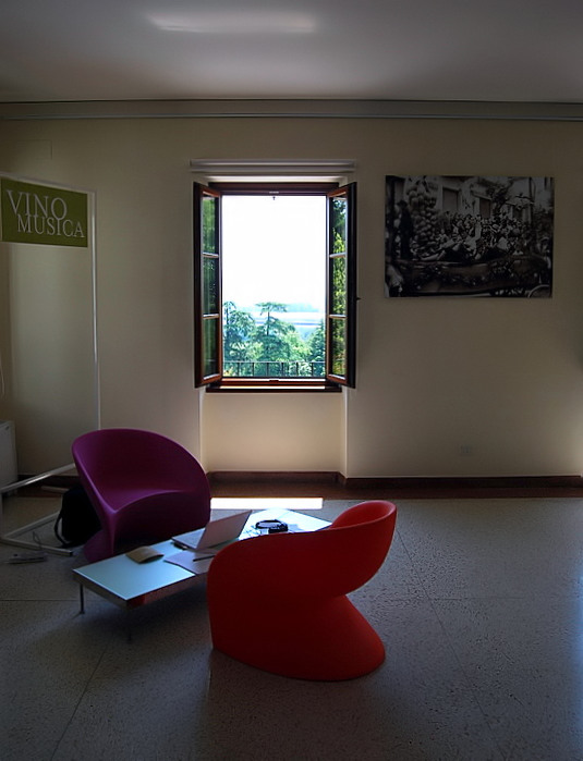 Fantasticamente, grazie all'insegna, la musica si può anche immaginare mentre il vino è richiamato dal color rosso e vinaccia delle due poltroncine...