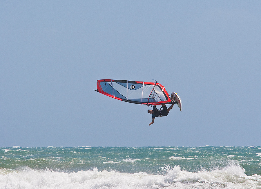 In questo tipo di foto, dove la rampa (onda) è mobile, non puoi mettere a fuoco prima ne ti puoi accordare con il surfer, ci sono troppe variabili... ci si deve affidare al AF. Nel mio caso ho scattato con una 30D con 70-200 f4 + 1,4X. ho scelto quindi di affidarmi al solo punto centrale per migliorare le performance del AF e chiaramente non c'è ne il tempo ne la possibilità di ricomporre (almeno con canon scattando in AF servo). In post non ho voluto croppare a destra, perchè mi piaceva si vedesse il punto di stacco dall'onda, per far meglio capire l'evoluzione della manovra.... col senno di poi avrei potuto tagliare il cielo in alto ottenendo un formato "16:9"