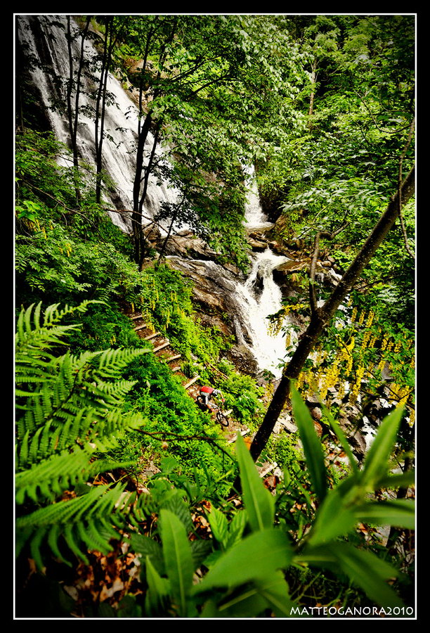 Amo molto le foto ambientate, qui la natura è bella ma a mio avviso è troppo dominante. Il rider anche se piccolo deve essere sempre il protagonista a mio avviso, qua sembra che il soggetto sia la cascata e il tipo in bici solo di passaggio per caso (si perde troppo tempo a cercarlo nello scatto). Io avrei chiuso di più l'inquadratura spostandomi magari anche a sinistra così da togliere quel tronco sulla destra.