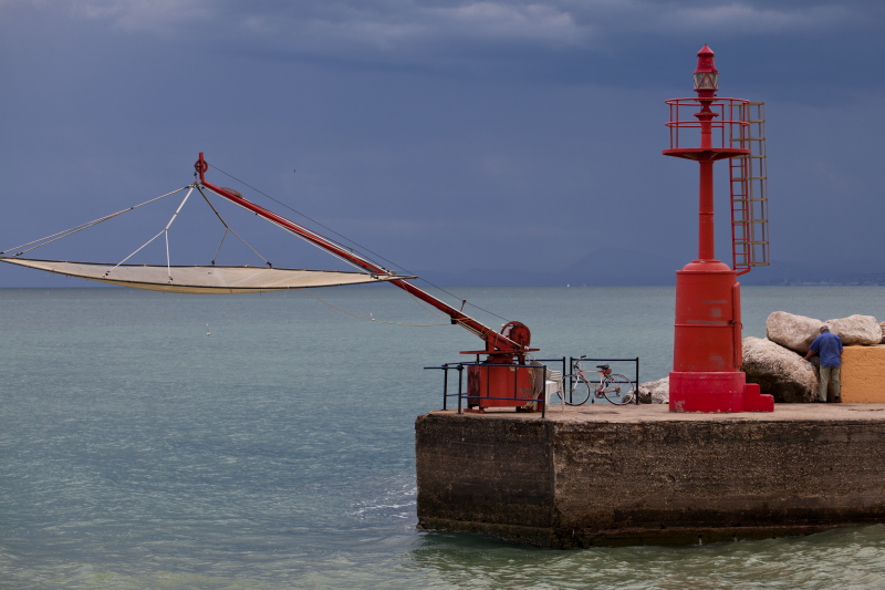 Non amo l'hdr, inoltre desideravo che l'attenzione si concentrasse sui colori così particolarmente saturi e accattivanti, sul mare, sul dettaglio del sistema di pesca e, non ultimo, sulla persona intenta a soddisfare i propri bisogni in lugo pubblico e per di più ben frequentato: speriamo si tratti di un paziente con seri problemi di prostata, forse avrebbe una minima scusante...