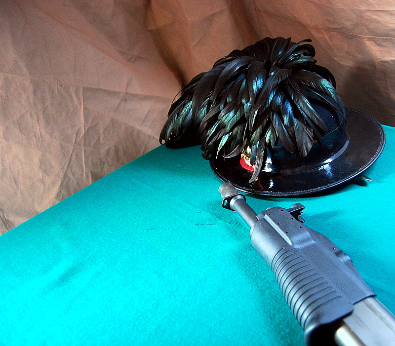 Quel panno che occupa inutilmente metà foto emoziona? L'arma appoggiata così vicino al cappello? E sfocata in basso. Le ombre fatte da - cos'è? - una lampada messa un po' così?