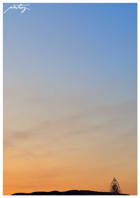 Il soggetto E' il cielo, o meglio la sfumatura del suo colore in quel momento particolare, con le eteree nuvolette a rimarcare il passaggio di tonalità, e un pezzettino di suolo giusto per non prendere troppo il volo
