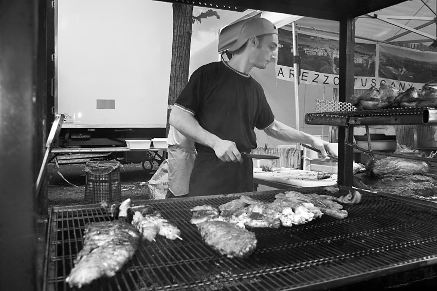| L'immagine ci mostra la figura di un giovane cuoco con in mano un coltello, davanti ad una brace con delle pietanze in cottura. Il tutto sembra svolgersi dentro quegli stand gastronomici all'aperto, tipici delle sagre o feste di paese, di cui si può intuire il luogo dalle indicazioni geografiche della cartellonistica che pende dallo sfondo sulla destra. L'autore riprende la scena dal basso e con un punto di vista decentrato, lievemente da sinistra, proponendo e mettendo enfasi nel primo piano sulla grande brace che occupa circa un terzo orizzontale del fotogramma. La messa a fuoco cade invece nei piani posteriori all'altezza del cestino dell'immondizia e coinvolge la figura del cuoco, una porzione occlusa di una seconda figura e tutto lo sfondo. Queste scelte tecniche si contraddicono a vicenda e la mancata messa a fuoco del primo piano disturba la lettura. La copertura della seconda figura rappresenta un'altro elemento di disturbo che poteva essere evitato. Il contenuto dell'istantanea è abbastanza ordinario e troverebbe giovamento in un lavoro a più ampio respiro, un reportage sulla manifestazione in oggetto. |