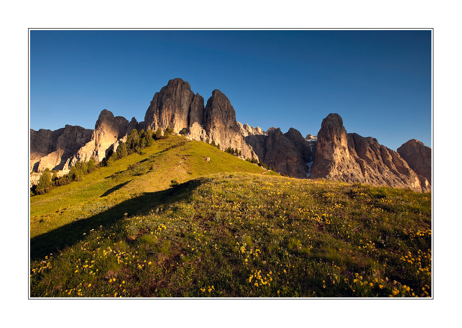 Qui il PP ben dettagliato e colpito da una luce superba guida lo sguardo verso le distese verdi,poi sulle Dolomiti dipinte dal sole.
