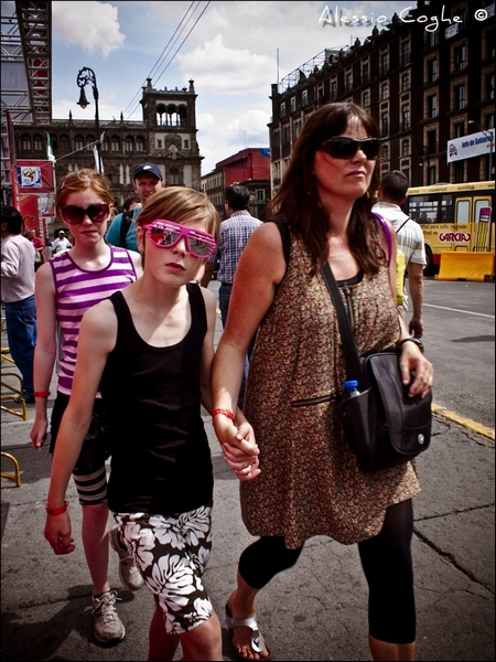 Una buona inquadratura questa di alxcoghe, il nostro strepher messicano... Lo sguardo in camera di quegli occhiali rosa è magnetico, forse anche per quell'inclinazione curiosa del capo della ragazza verso destra. Tutto il resto è ben amalgamato: passi estesi, la forte stretta di braccia fra la mamma e la ragazza, l'altra sorella dietro a seguira. Piccola indecisione sul volto alle sue spalle. Una scena dinamica, genuina, ripresa per strada alla Bruce Gilden..