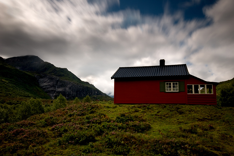 qui cercherò di dire qualcosa di più articolato. Quello che salta più all'occhio è il contrasto tra la casa e le montagne immobili e il cielo che fugge (e non posso non pensare che il paradiso può essere considerato un arresto del tempo). Mi piace anche il fatto che si intraveda il profilo della montagna attraverso i vetri sulla destra. Ultima impressione: la casa che sembra (e forse è) solo appoggiata al terreno: il non-attaccamento personificato.