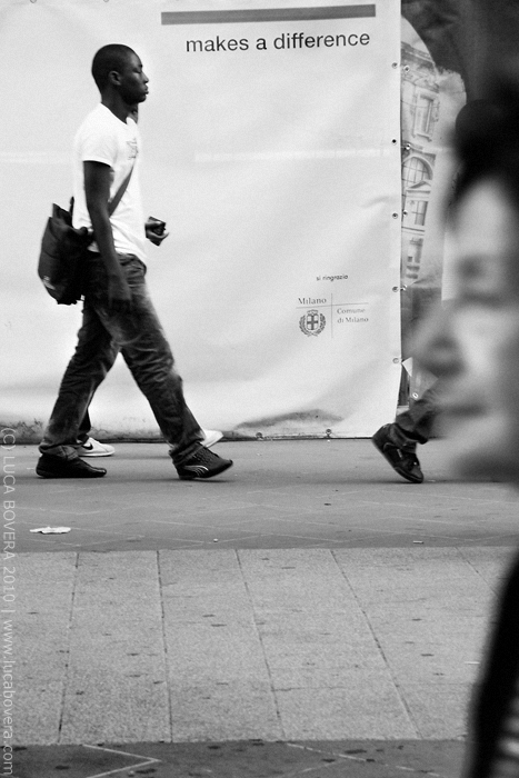 Come idea poteva essere buona Aspesio ma la realizzazione non funziona. Interessante il contrasto fra l'uomo di colore sullo sfondo e la transfuocatura del primo piano di una ragazza bianca. Converraii con me che la gamba che spunta dalla bocca di quest'ultima ha l'effetto di un errore piuttosto che di una scelta vera e propria: ad avvalorare l'ipotesi è anche la netta differenza di fuoco che allontana qualsiasi tentativo di sovrapposizione iconica significativa. La sovrapposizione di una seconda figura all'uomo di colore sullo sfondo, visibile a livello delle scarpe da ginnastica , non aggiunge niente di nuovo e contribuisce alla stessa sensazione di scatto sperimentale. Continua comunque su questa strada che i lavori arriveranno  |
