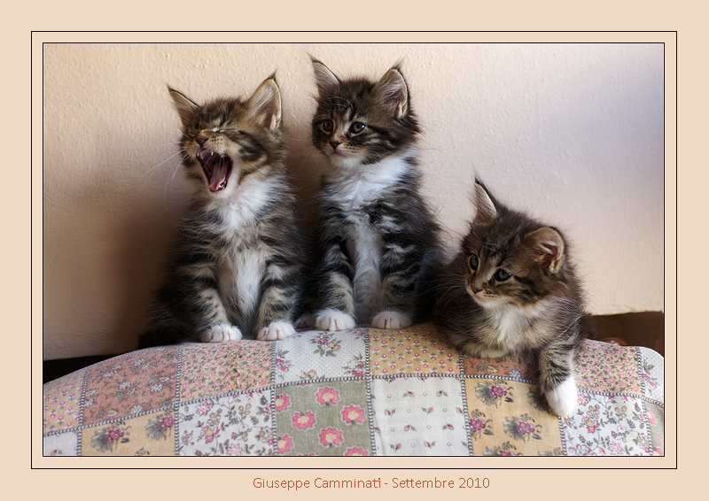 Tre meravigliosi micetti, tre caratteri diversi, il primo a destra sarà, da adulto, quello più saggio e più posato, quello al centro un probabile discolo, dispettoso e giocherellone, l'ultimo il più fregnone, sarà quello che avrà sempre bisogno della mamma, quello che vorra sempre mangiare per primo e se non succederà piangerà... un bamboccione per usare una frase in voga oggi