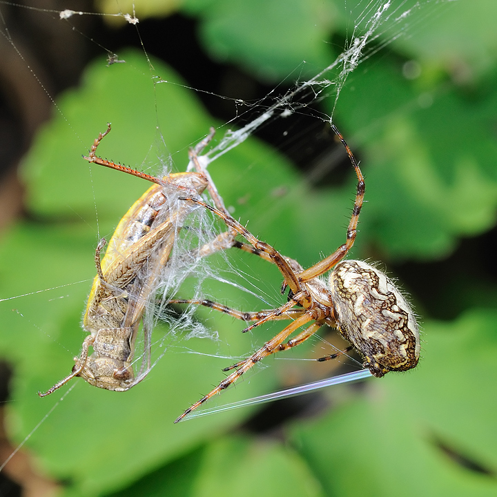 Una povera cavalletta finisce nella trappola e viene immobilizzata in un batter d'occhio...