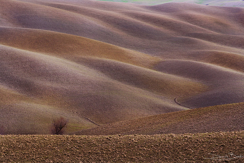 Te lo torno a dire anche qui: bellissima! Mi piace in modo particolare la consistenza del terreno, che si percepisce quasi al tatto. L'alberello e i due solchi spezzano splendidamente e discretamente la continuità di queste crete. Sull'orizzonte verdino alla fine... boh, non saprei, ma è possibile che abbia ragione Paolo: hai provato a rifilarla?
