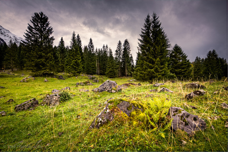 Il colore dell'erba può effettivamente sembrare esagerato, ma visto che pioveva e l'erba era fradicia i colori erano estremamente saturi già in natura, calcolando poi che i prati dell'Appenzello (come in molte altre zone particolarmente piovose della Svizzera settentrionali) sono di un verde molto carico, dove invece al sud delle alpi risultano molto più slavati.