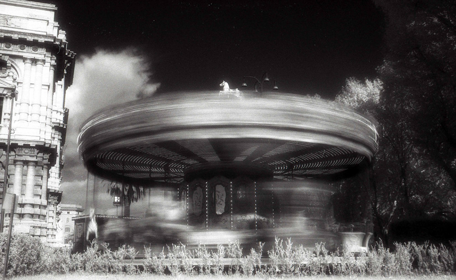 In questa foto il prato verde è stato volutamente escluso. Non mi interessava tanto l''effetto infrarosso quanto dare importanza alla giostra. In questo già sfuggente mondo dove il movimento rende tutto etereo ho pensato che i cavalli in corsa sarebbero stati poco più che fantasmi. I bambini che erano sopra sono rimaste presenze appena percettibili rendendolo un carosello spettrale che gira a vuoto. _________________ Il mio sito http://www.fabiobozzetti.com/