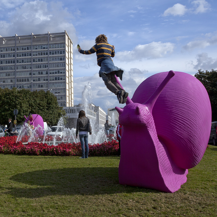 L’istantanea di Liliana rappresenta il salto composto di un giovane, non ben identificato, dall’alto di una rappresentazione plastica ingrandita e colorata di una lumaca, all’interno di una zona verde urbana. Sul piano medio è presente una fontana circondata da un’ aiuola di fiori, un’altra lumaca gigante e altre figure umane. Sullo sfondo dei palazzi ed uno scorcio di cielo con nuvole. Liliana compone fotograficamente bene utilizzando un fotogramma quadrato: pone al centro della scena il gesto atletico del ragazzo, creando un buon rapporto figura-sfondo. La luce è alta e dura creando dei forti contrasti. Le scelte tecniche e compositive dell’autrice danno quindi notevole importanza a questo “movimento bloccato”, ripreso nella sua fase “durativa”, cioè mentre si svolge effettivamente. Ed è questo che ci voleva comunicare: il salto un po’ coraggioso e composto da un’insolita lumaca gigante color lilla, di un fanciullo non ben identificato. Una scena frutto di un ragionamento street, abbastanza “insolita”, ma non sufficientemente. Il valore, se così si può definire, di questo “insolito” dipende in misura dalla rappresentazione “artistica” della lumaca gigante color lilla, il cui merito è da ricondurre al suo creatore nativo, ed in parte all’autrice della fotografia che la utilizza per presentare il suo “momento street”, rappresentato da un ragazzo non ben identificato , che salta da questa. Questo secondo aspetto non riesce, a mio personale avviso, a destare una sorpresa tale da rimanere impressa; molto di più fanno i colori saturi di questa lumaca gigante. Il salto del ragazzo e rappresentato bene ma non è particolarmente significativo. Vorrei condividere con voi e con l’autrice dello scatto un mio pensiero: si è creata una certa ambiguità nella tipologia di scatti “street riusciti”, una specie di confusione concettuale, interpretando “l'istante decisivo” come “l'attimo fuggente”, cioè il compiersi di un evento in un lasso di tempo al limite della velocità di reazione dell’otturatore di una reflex. La fotografia in questione testimonia sicuramente la prontezza di riflessi di Liliana, il suo occhio, che riesce a congelare la figura del ragazzo che salta, perfettamente staccato e nel chiarore del cielo retrostante, ma ha la staticità di un presepe con tanto di angelo sospeso in atteggiamento irreale. L’istantanea non riesce ad impressionare oltre il composto e coordinato gesto atletico. Quello che vorrei evidenziare è che “l'istante decisivo” in termini generali, non è oggettivamente da ricercare nella scena reale, e non deve sempre essere preso al volo come un tiro al piattello, ma deve crearsi nella mente del fotografo, quando riconosce soggettivamente che tutti gli elementi della scena sono al posto giusto, in un giusto rapporto tra di loro e con l'ambiente che li circonda, in modo da creare un significato aggiuntivo. Non vi è dubbio che in un ambiente continuamente mutevole l'occhio allenato dello streepher riconoscerà più facilmente le occasioni favorevoli e riuscirà meglio a fermare sulla pellicola o sul sensore quelle di breve durata, ma lo spazio per esprimersi è molto più ampio di quello che si pensa, senza necessità di competere in velocità con raffiche degne delle più tecnologiche ammiraglie reflex. Nel caso in questione la prontezza di riflessi dell’autrice congela brillantemente l’azione umana, senza però creare lo “scarto” dalla norma, se non per il “contesto insolito” rappresentato dalla lumaca gigante color lilla. L'istante decisivo può essere anticipato e giungere alla fine di un'attesa più meno prolungata; a volte non esiste un vero e proprio evento in evoluzione da dover bloccare nel suo continuum: la scena è statica ed il fotografo ha tutto il tempo per scattare la sua istantanea. Ci sono attimi decisivi dove le persone sono addirittura ferme o in attesa o addirittura stanno dormendo. Per tornare all’istantanea di Liliana ed al suo effetto potrei concludere che si tratta di una fotografia tecnicamente ben eseguita ma dal contenuto squisitamente street debole. Anche se è presente un buon “attimo congelato” la vedo più come la rappresentazione di una situazione simpatica e ben raccontata, ma non la reinterpretazione della realtà, la messa in evidenza di un aspetto particolare della realtà grazie alla ri-contestualizzazione dell’autore.