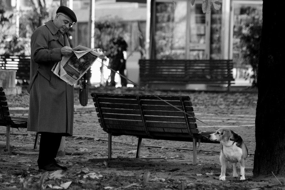 Bella foto , bel bn la pazienza di quel cane che aspetta fiducioso che il padrone finisca di leggere , è la chicca del fotogramma Smile