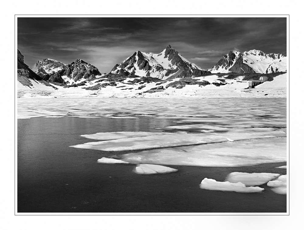 ben composta questa immagine che, dal primo piano del lago semi-ghiacciato, si dipana su piani diversi fino alla bella catena di montagne. come detto da altri, bn di pregio.