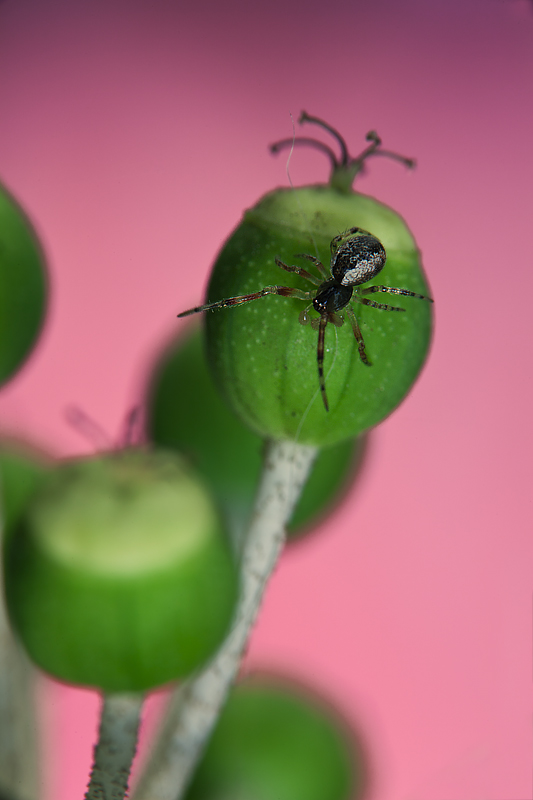 Stavo fotografando queste piccole sferette (+- 4mm di diametro) dell'infiorescenza di un'aralia, quando mi sono accorta che erano abitate da un ragnetto di circa 1,5mm.