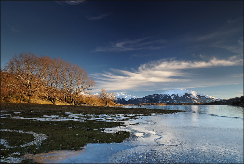 Personalmente però avrei cercato un'inquadratura più bassa, in modo da avere in primo piano le geometrie del ghiaccio o gli arabeschi disegnati dalla neve parzialmente sciolta sull'erba; ciò anche a discapio della parte superiore del cielo meno interessante (ancorchè piacevole nel suo digradare verso il blu intenso).
