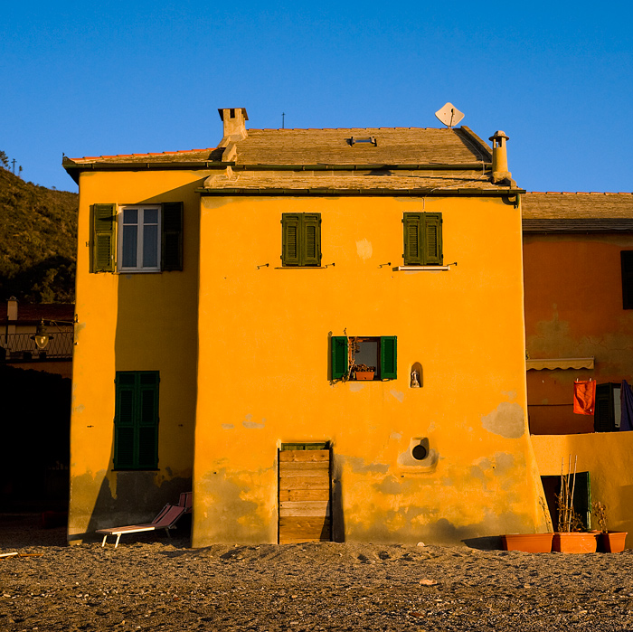 La foto, di grandissima semplicità, è resa incantevole dalla luce e dalla contrapposizione del giallo-arancio intenso della casa coll'azzurro intensissimo del cielo. Mi piace un sacco.
