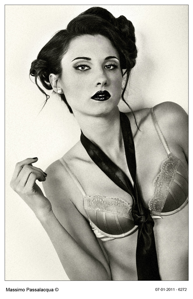 Ciao Massimo, della serie con Valentina in b/n questa mi sembra la più elegante nella sua posa fintamente disinvolta, una nonchalance d'altri tempi e di altre abilità attoriali; anche la tua interpretazione stillistica rende perfettamente giustizia alla scelta operata, la cifra del b/n "granuloso" dei toni apparentemente sbiaditi ma con dei neri di intensità assoluta (chissà in stampa se si riesce ad ottenere la stessa forza), fanno di quest'immagine un riferimento, per chi come me ama il bianco e nero. Si sprecano solo lodi per il tuo lavoro non essendoci nulla da togliere o da aggiungere, è perfetto!
