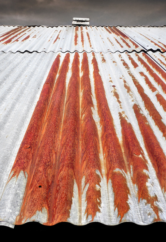 Ci ho visto il metallo, sia nell'ondulato della lamiera che nella ruggine che si erge quasi a protagonista. Ma belli anche il cielo dalle tonalità apocalittiche e quell'innocuo camino che sembra quasi una sentinella minacciosa.