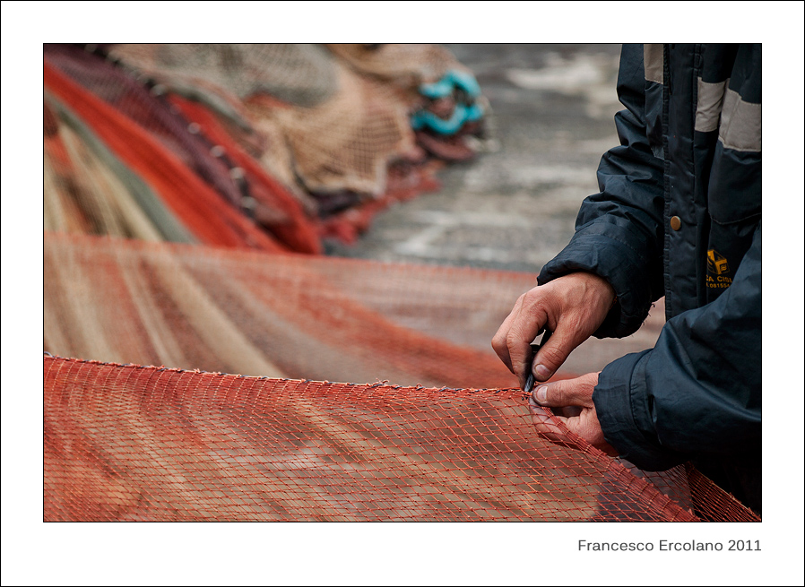 ti posso solamente dire che spesso vengono ritratte le mani dei pescatori in questi gesti abitudinari...qui però si evidenzia la delicatezza , l'estrema attenzione e la precisione di un lavoro duro messo in risalto dalla montagna di reti trattate nello sfondo sfocato...