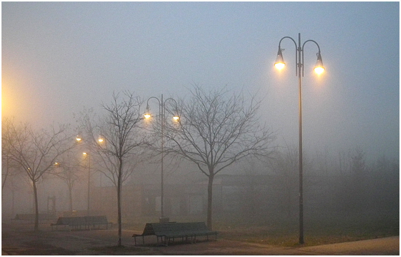 L'immmagine non è male, rende effettivamente la strana solitudine silenziosa che si fa strada in un angolo come questo, immerso nella nebbia. Io tenterei però di correggere il forte rumore che intacca ogni parte della ripresa, per prima cosa, almeno nella parte ampia ed omogenea del cielo, senza rischio di perdere troppi particolari. Ora è difficile poi rimediare, in una futura occasione però ti consiglierei di soppesare con cura la composizione, che spesso fa la differenza fra una foto anonima ed una da ricordare.
