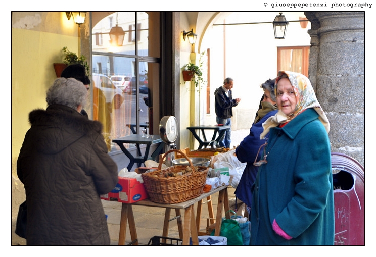 Amp indecisa l'inquadratura, in bilico tra concentrarsi sul singolo banchetto (dove però chi vende è coperto dalla signora a sx e il punto di presa non "fa entrare" nella scena: non si distinguono i prodotti, le signore attendono) e aprirsi a quanto c'è attorno (il riflesso nella vetrina, l'uomo sullo sfondo ben delineato dal muro chiaro).