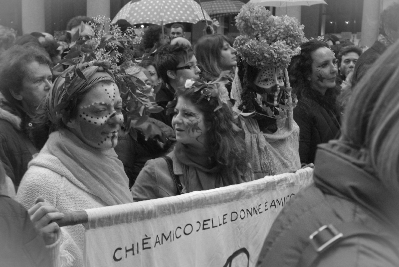 Personalmente l'avrei scattata a colori, per sottolineare che l'evento non è solo di protesta e rabbia, ma anche di unione e collaborazione fra i partecipanti, le espressioni delle protagoniste trasmettono serenità e convinzione, le loro maschere hanno un forte potere simbolico, valeva la pena sottolinearlo con la vivacità dei colori.