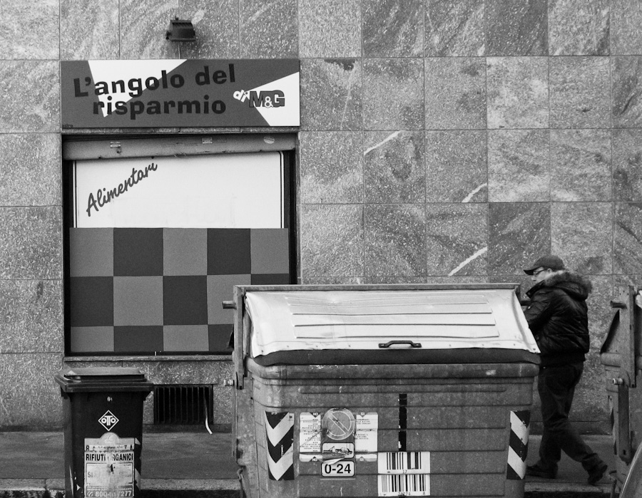 bella contraposizione tra la scritta delll'insegna ed i cassonetti,