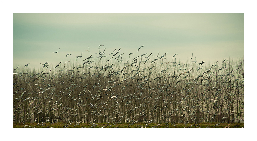 Il cielo sgombero è la campitura di colore uniforme e leggera che contrapponendosi alla sovrapposizione uccelli/alberature genera una foto di impatto grafico, lineare .
