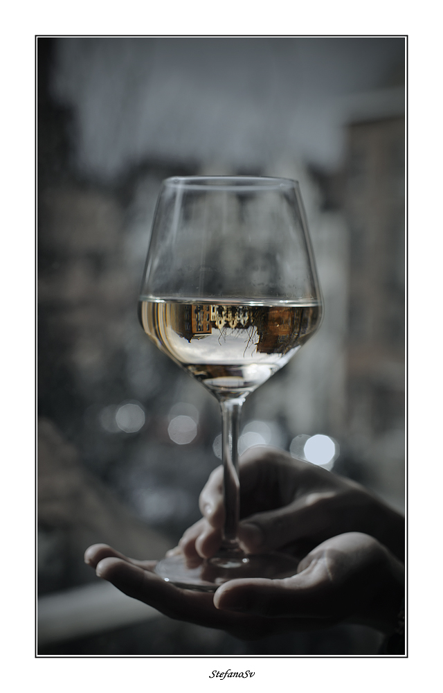 la foto era diritta, il problema e' che la mia ragazza nn ha proprio una mano ferma (ho dovuto scattare a tempi abbastanza rapidi), si muoveva molto (ho dovuto raddrizzare la foto, si nota nello sfocato una leggera pendenza degli edifici, motivo per cui il liquido dentro nn e' perfettamente allineato); Ho usato la desaturazione/viraggio al di fuori del liquido per sottolineare il sottosopra (stiamo parlando di circa 20 secondi di post produzione ).