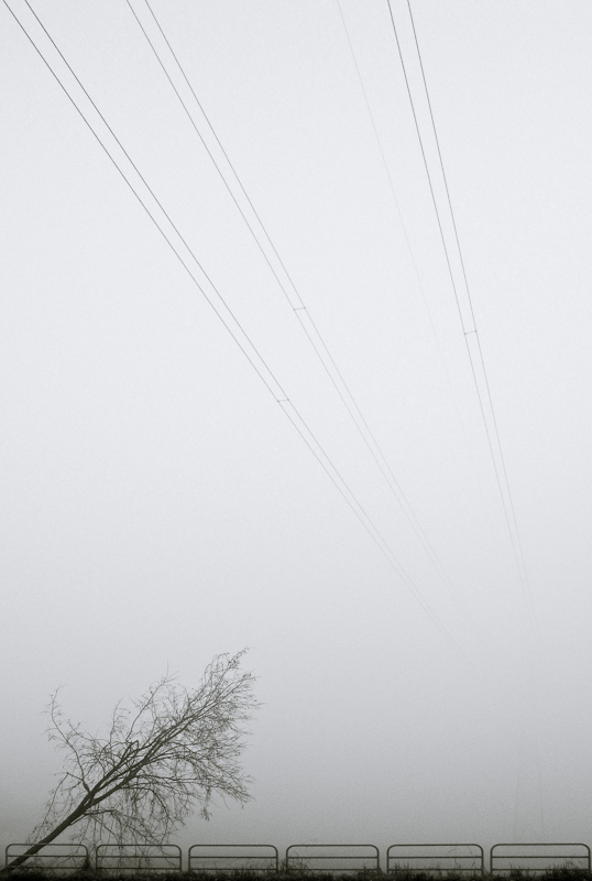 Particolarissima. Hai dato una interpretazione davvero originale a questo paesaggio nella nebbia, ed a questo sottile albero piegato. L'incontro di linee che convergono nel bianco latteo dello sfondo potrebbe effettivamente suggerire l'iddea di una attrazione, un magnetismo, uno strano vortice che assorbe la realtà presente. Diciamo che dal paesaggio è uscita una visione preterintezionale... ( dite che il ternine legale ci sta? )