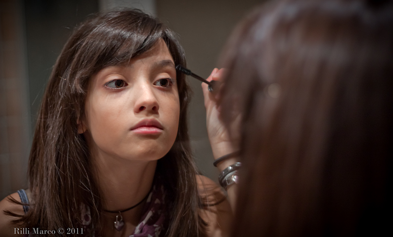 C'è in quella gestualità, ...in quel truccarsi attenta davanti allo specchio, un forte senso di intimità con se stessa: è ...un istante fatto di compiacimento, aspettativa, ....che pare per magia dare sostanza a quel miscelarsi di una dimensione ancora infantile con quella di una donna già consapevole.