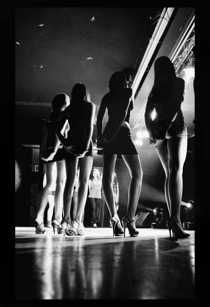Si legge la tensione che hanno le ragazze sul palco prima della prova, del concorso o del giudizio. In bilico su tacchi vertiginosi mentre si tengono strette le mani nelle mani che fremono per quello che dovranno fare...il punto di ripresa basso fa sembrare lo spettatore piccolo piccolo come se fosse lì, nel retroscena, quasi per caso e avesse scostato la tendina per sbirciare dietro, sul palco, cosa succede, slanciando contemporaneamente le modelle ancor più in alto.