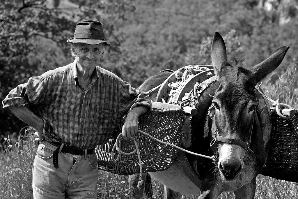 Bel quadretto di uno dei mezzi di trasporto più antichi del mondo e del suo carico. La bella conversione in b/n restituisce una foto senza tempo, ma attuale al tempo stesso che calza perfettamente al contesto. L'espressione del nonnetto ne completa l'efficacia emotiva con quel sorrisino simpatico.