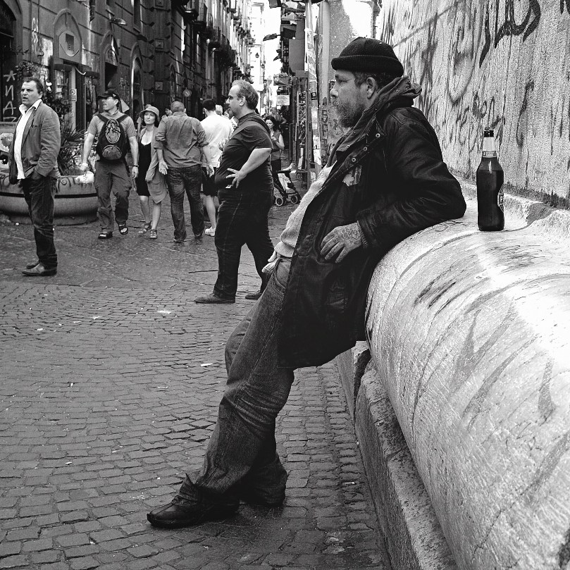 La foto mi piace, ma se posso permettermi avrei tagliato qualche cm ancora a dx includendo comunque la bottiglia, il "cornicione" è molto luminoso ed ingombrante, inoltre visto il contesto l'avrei chiamata "vagabondi". ciao ciao  _________________ Sono le condizioni peggiori a rendere le cose straordinarie!