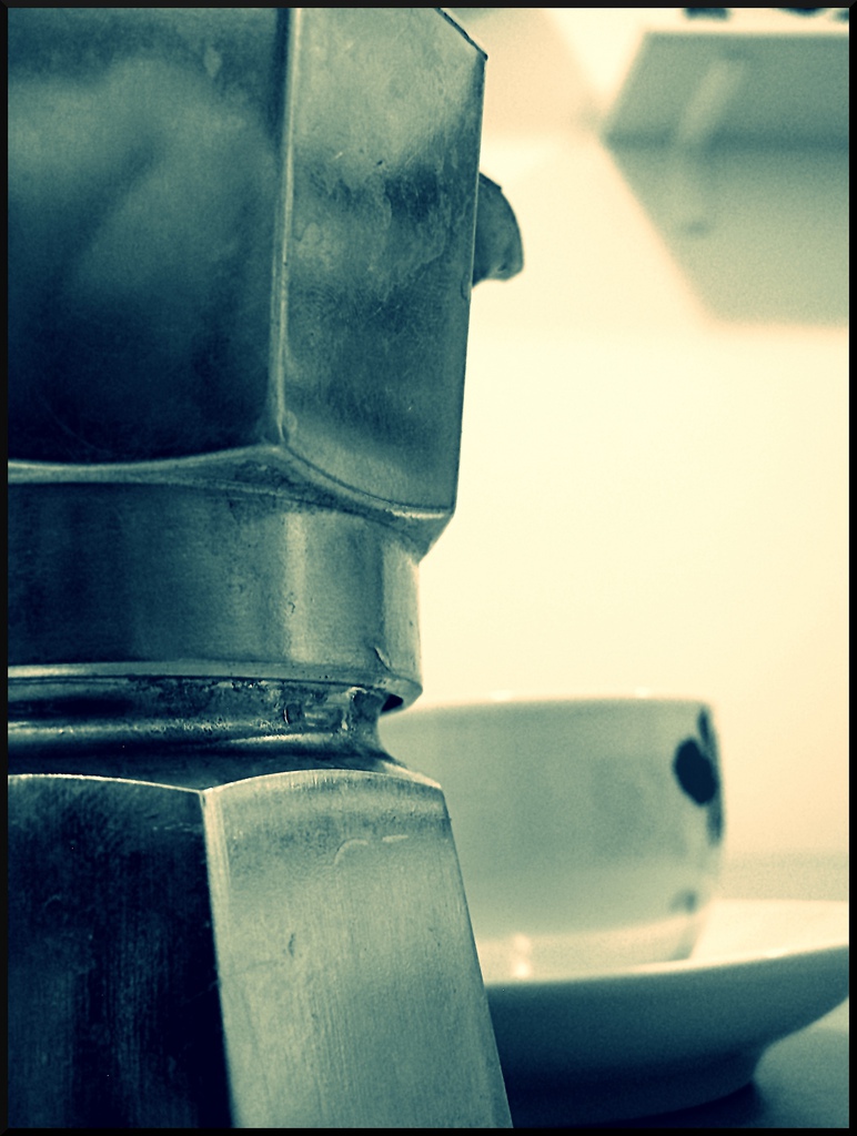 bello questo scatto, il PP della moka classica con la tazzina fuori fuoco dietro, mi piace molto anche il viraggio.