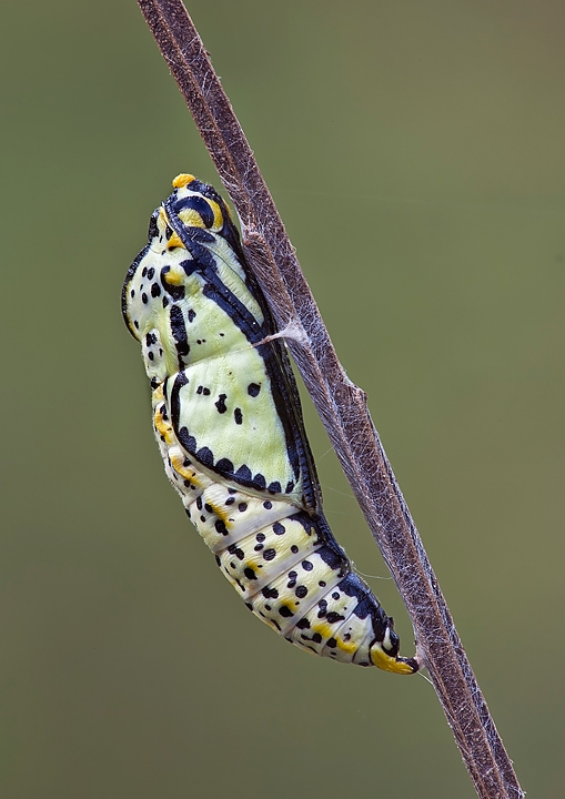 Noto una nitidezza impressionante sia sulla crisalide che sul posatoio fasciato dai micro fili di sostegno.