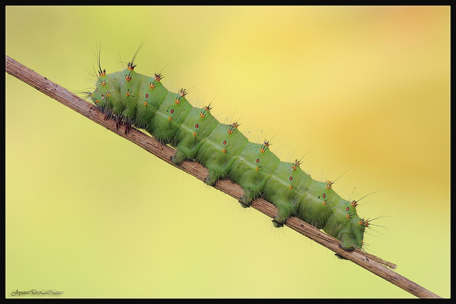 Ora, dominanti a parte, il soggetto appare ben ripreso... forse il diaframma aperto ad f/8, non ti ha permesso di ottenere più pdc, che nel caso di ripresa di bruchi, non è mai abbastanza... sfondo bellissimo e luminoso, soggetto leggermente in ombra... con un pannellino riflettente, lo avresti illuminato...